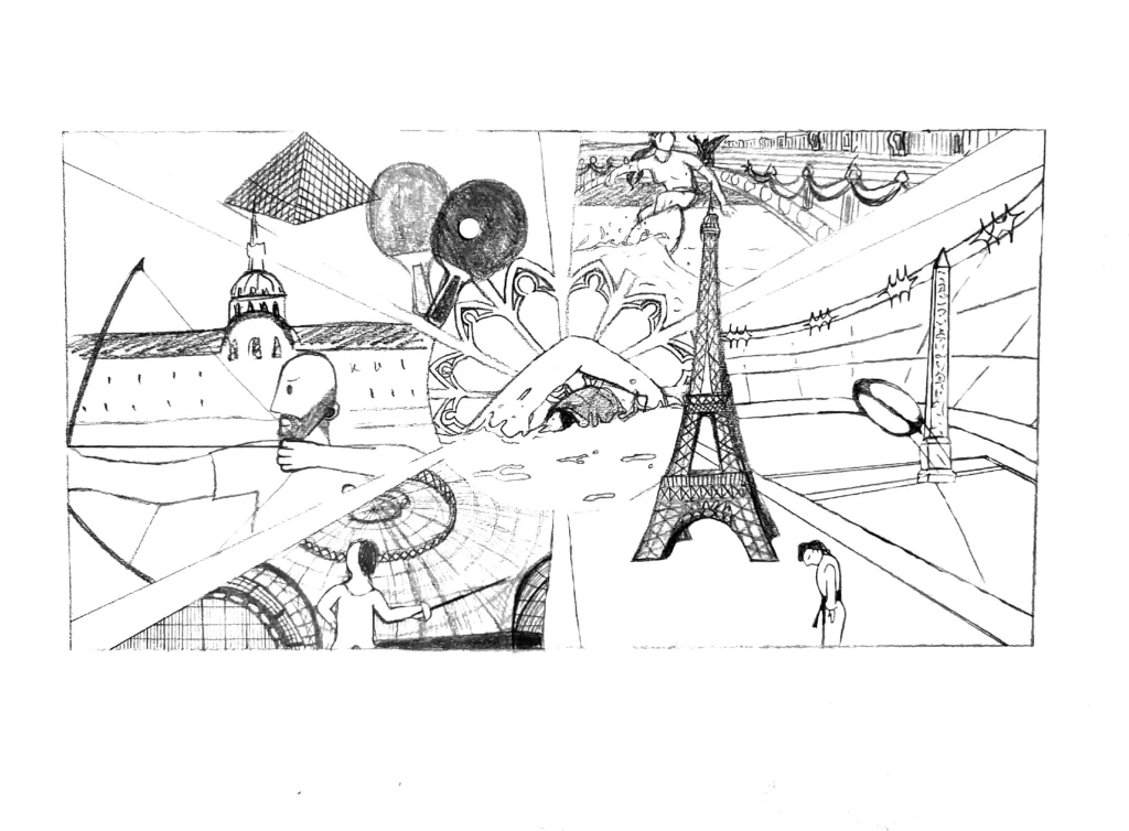 En binôme, création de fresques murales pour l’école de sport business AMOS de Rennes. Le thème étant les Jeux Olympiques, l’une des fresques devait représenter les jeux de Paris 2024, l’autre ceux de Los Angeles 2028. En trichromie, aux couleurs de l’école.